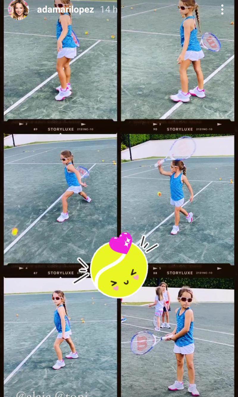 La hija de Adamari López y Toni Costa lució un conjunto deportivo formado por un short blanco, una camiseta sin mangas color azul, unas zapatillas deportivas blancas con toques rosados, un par de gafas súper chic y por supuesto, sin inseparable raqueta. Para estar lo más cómoda posible, Alaïa llevó su cabello en una coleta alta con una trenza. Mientras ella practicaba los saques y otros golpes, su orgullosa mamá grababa todo con su teléfono, presumiendo lo hábil que es su pequeña.