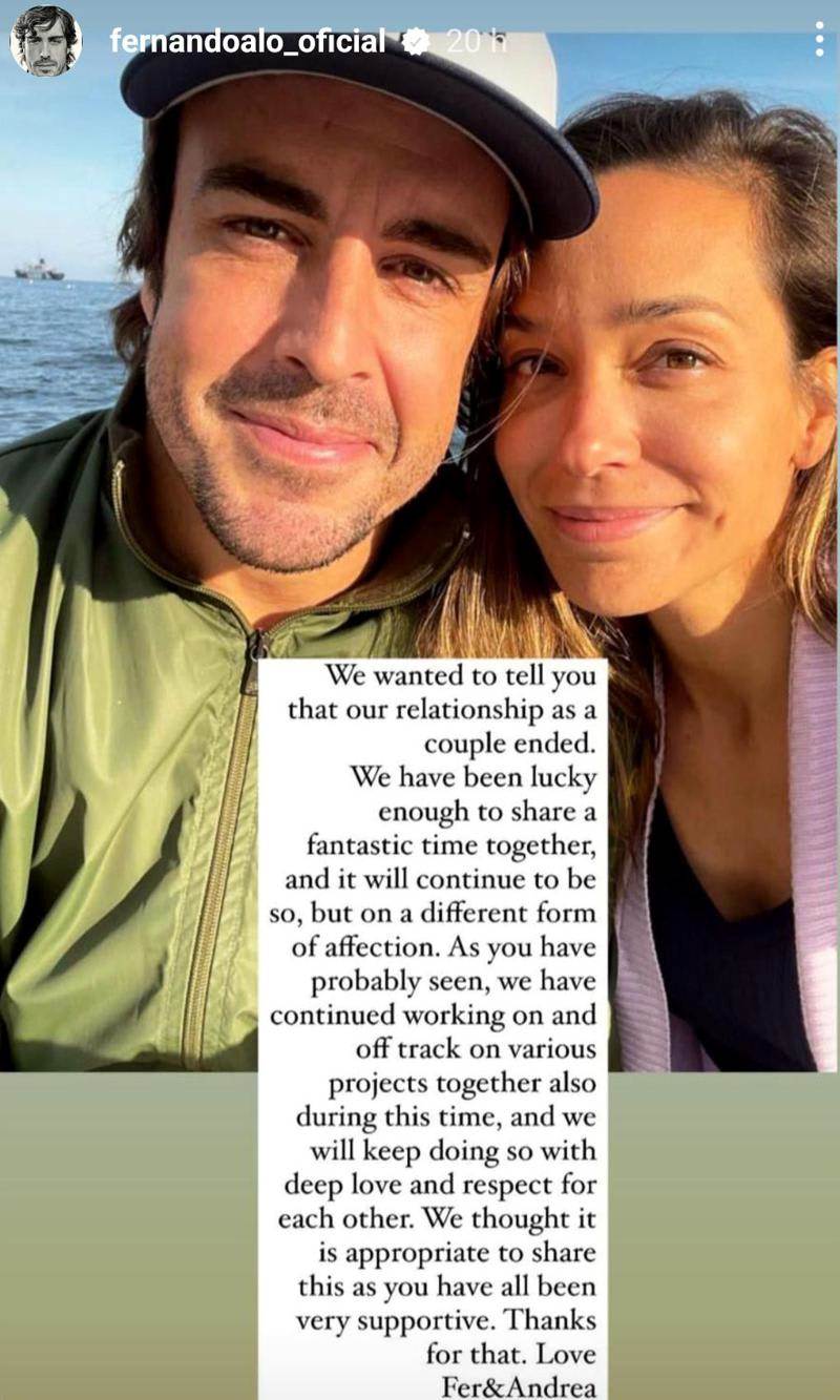 A principios de abril, Fernando Alonso dio a conocer su separación de Andrea Schlager luego un año de noviazgo. El piloto y la comunicadora austriaca dieron cátedra de madurez al anunciar su decisión por medio de un mensaje conjunto que publicaron en sus redes sociales. Y aunque seguramente muchas fanáticas de esta estrella de la F1 se ilusionaron con su soltería, todo parece indicar que su corazón está ocupado de nuevo.