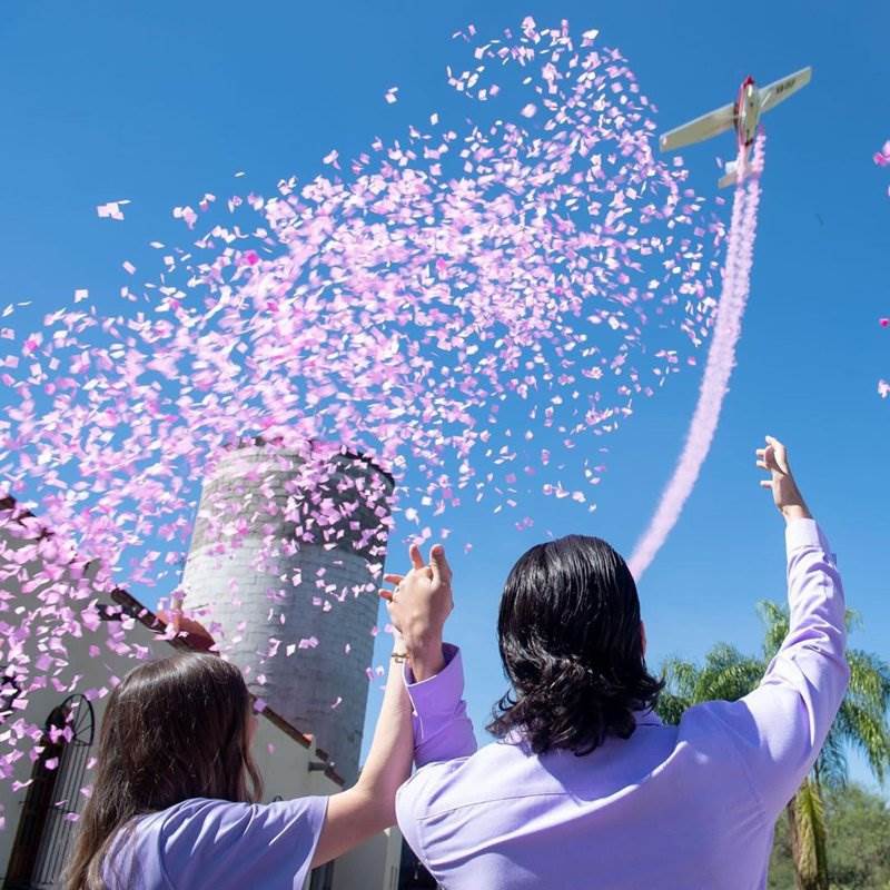 Para la ocasión la pareja lució unos atuendos coordinados en color lavanda, un tono entre azul y rosado. El sexo del bebé lo revelaron con la ayuda de una avioneta; la aeronave pasó justo debajo de ellos y de sus invitados dejando una estela de humo rosa. En cuanto lo vieron, todos empezaron a gritar de emoción y la pareja se fundió en un tierno abrazo, al mismo tiempo que lanzaron unas bombas de confeti con papelitos rosados.