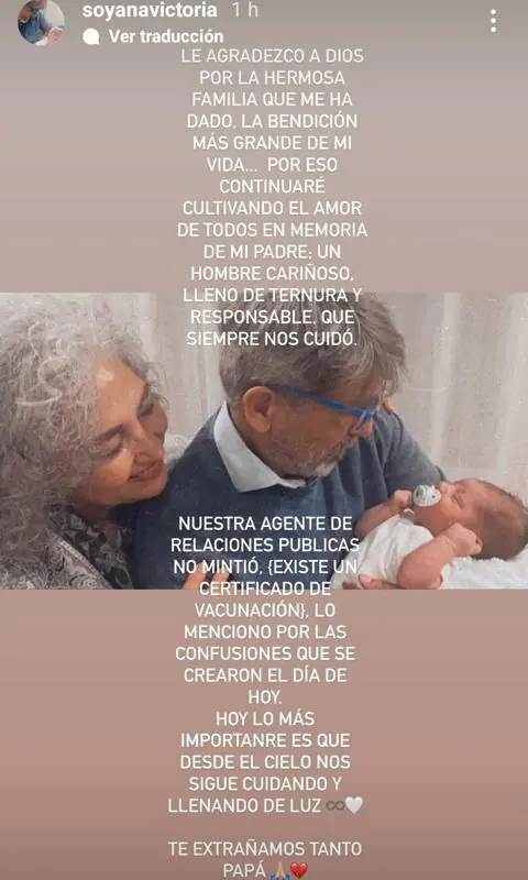 “Nuestra agente de relaciones públicas no mintió (existe un certificado de vacunación), lo menciono por las recientes confusiones que se crearon el día de hoy. Lo más importante es que desde el cielo nos sigue cuidando y llenando de luz... Te extrañamos tanto papá, el sol de nuestra vida”.
