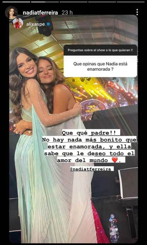 En una dinámica de preguntas y respuestas con sus seguidores, un follower le preguntó a Aspe lo siguiente: “¿Qué opinas de que Nadia está enamorada?”. A lo que ella respondió: “Que qué padre!! No hay nada más bonito que estar enamorada, y ella sabe que le deseo todo el amor del mundo”. La respuesta de Alix fue replicada por Nadia en sus stories, con lo cual deja ver que hay una gran complicidad entre ellas.
