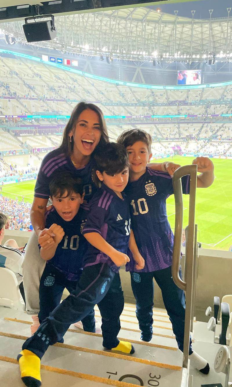 En su post, Antonela agregó un par de fotos junto a los otros porristas favoritos de Messi: sus hijos Mateo, Thiago y Ciro. Los pequeños y su mamá lucieron orgullos la camiseta de la selección argentina y posaron desde las gradas en el Estadio Lusail, con la cancha a sus espaldas. Las expresiones de los pequeños no dejaron dudas respecto a su sentir ante el triunfo de la selección de su país, así como el de su famoso papá.
