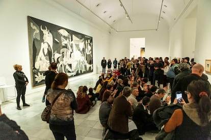 “Nos están matando a todos”, se escucha antes de dirigirse a la sala del Guernica, pasados 10 minutos. Las pegatinas en la ropa de los manifestantes que rezan: “IVA Cultural ya”, pasan completamente inadvertidas para los visitantes del Reina Sofía: “No entiendo nada”, exclaman algunos frente a la obra de Picasso. La indiferencia de quienes pasean por las salas no es la que pesa, sino la del Gobierno que mantiene el 21% desde 2012 —decidida por el entonces ministro de Hacienda, Cristóbal Montoro—.