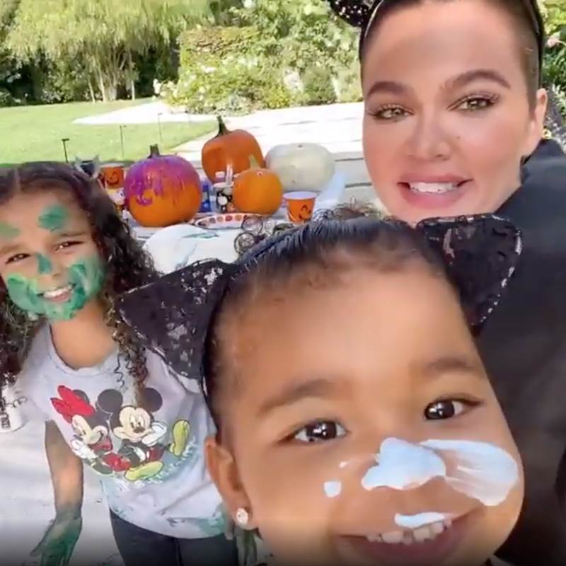 Khloé no ha dudado en hacer muchas fotos y videos de True jugando con sus primos , Los hijos de Kim Kardashian y de Kanye West coloreando calabazas.