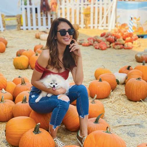 La modelo ha compartido este post sentada junto con su mascota sobre un huerto de calabazas bajo el título Trick or Treat?