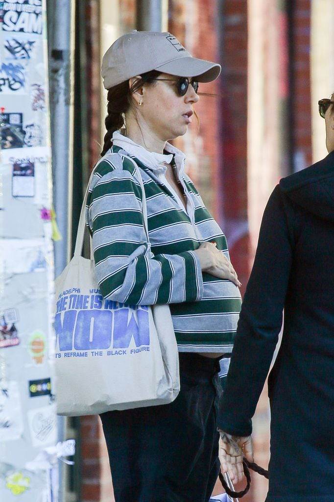 La intérprete usaba un atuendo informal perfecto para estar cómoda en su ‘dulce espera’: unos pantalones rectos azul marino, una camiseta a rayas de cuello polo en verde y gris, loafers negros de charol y una gorra beige. Además, usaba unas gafas de sol y llevaba al hombro un bolso de tela. Confiando en su brillo premamá, Aubrey optó por no usar maquillaje y llevó su melena castaña peinada en una trenza, con algunos mechones sueltos.