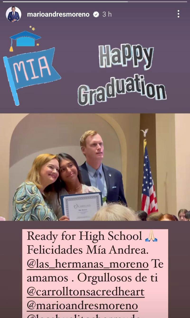 Mario Andrés hizo lo propio, y también expresó su felicidad por el logro de su hija y compartió la misma foto que su esposa, así como un mensaje similar. Y en sus historias de Instagram, publicó un video del momento preciso en el que Mía recibe su diploma. “Lista para la high school. Felicidades, Mía Andrea, te amamos. Orgullosos de ti”, escribió el periodista.