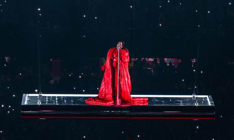 Cuando el marcador se inclinaba hacia los Eagles (que terminarían siendo vencidos por los Chiefs), Rihanna se hizo presente en el centro de la la cancha y de una forma muy original: en una plataforma suspendida. En su aparición —no apta para aquellos con miedo a las alturas—, la cantante de inmediato acaparó las miradas con su llamativo look rojo, en contraste con los atuendos blancos de los bailarines.