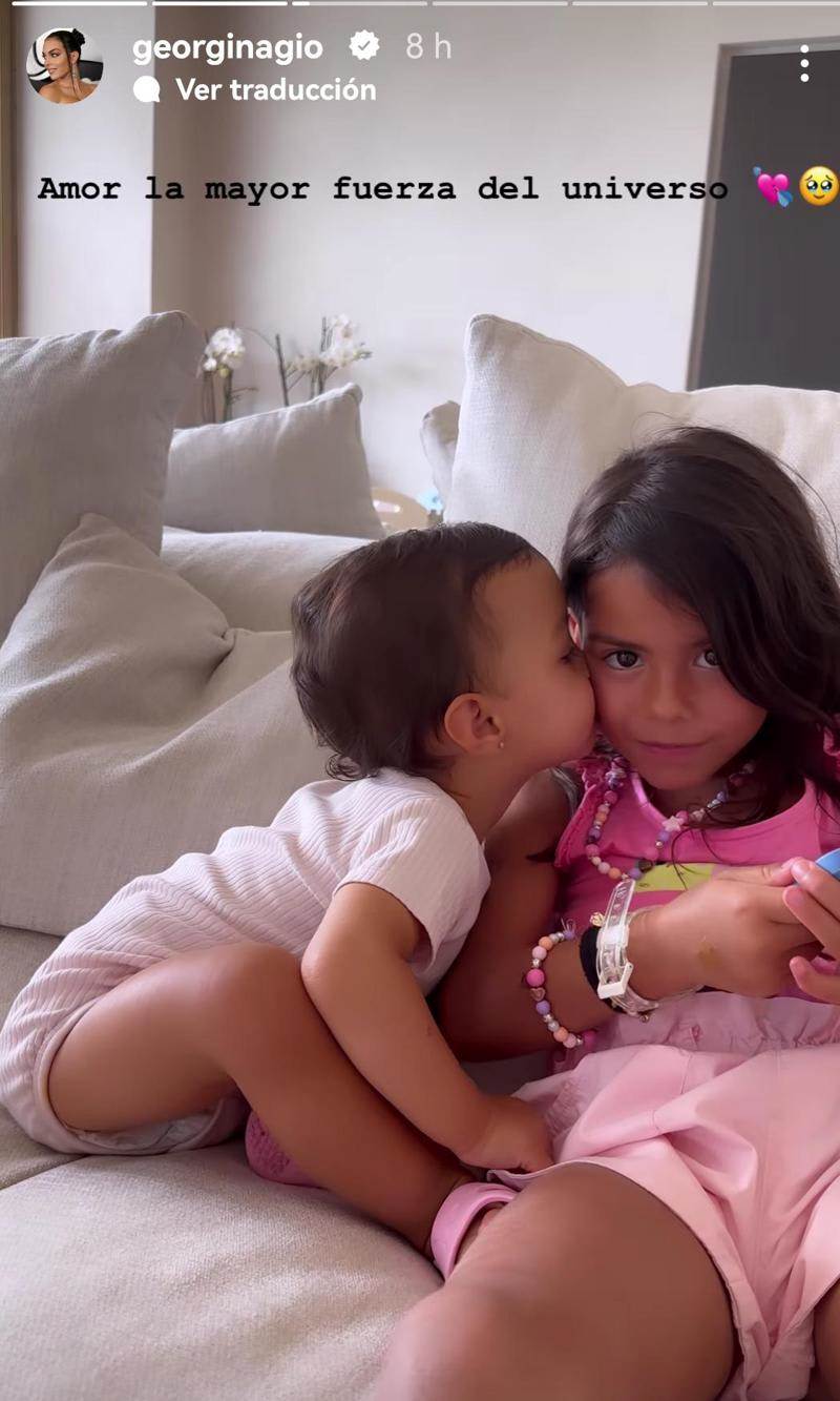 La modelo e influencer compartió el tierno video en Instagram stories y este fue retomado por varias cuentas de fans. En el video se alcanza a escuchar a Georgina, quien dice en repetidas ocasiones: “Uy, uy, uy cuánto amor de las hermana”, “Cómo os quereis”, “Uy las hermanas se aman”. En el video se aprecia a Bella Esmeralda llenando de tiernos besitos a Eva María, quien es mayor que ella por cinco años. Mientras la bebé le demuestra su cariño a Eva, esta se mantiene quietecita recibiendo los mimos de su hermana menor.