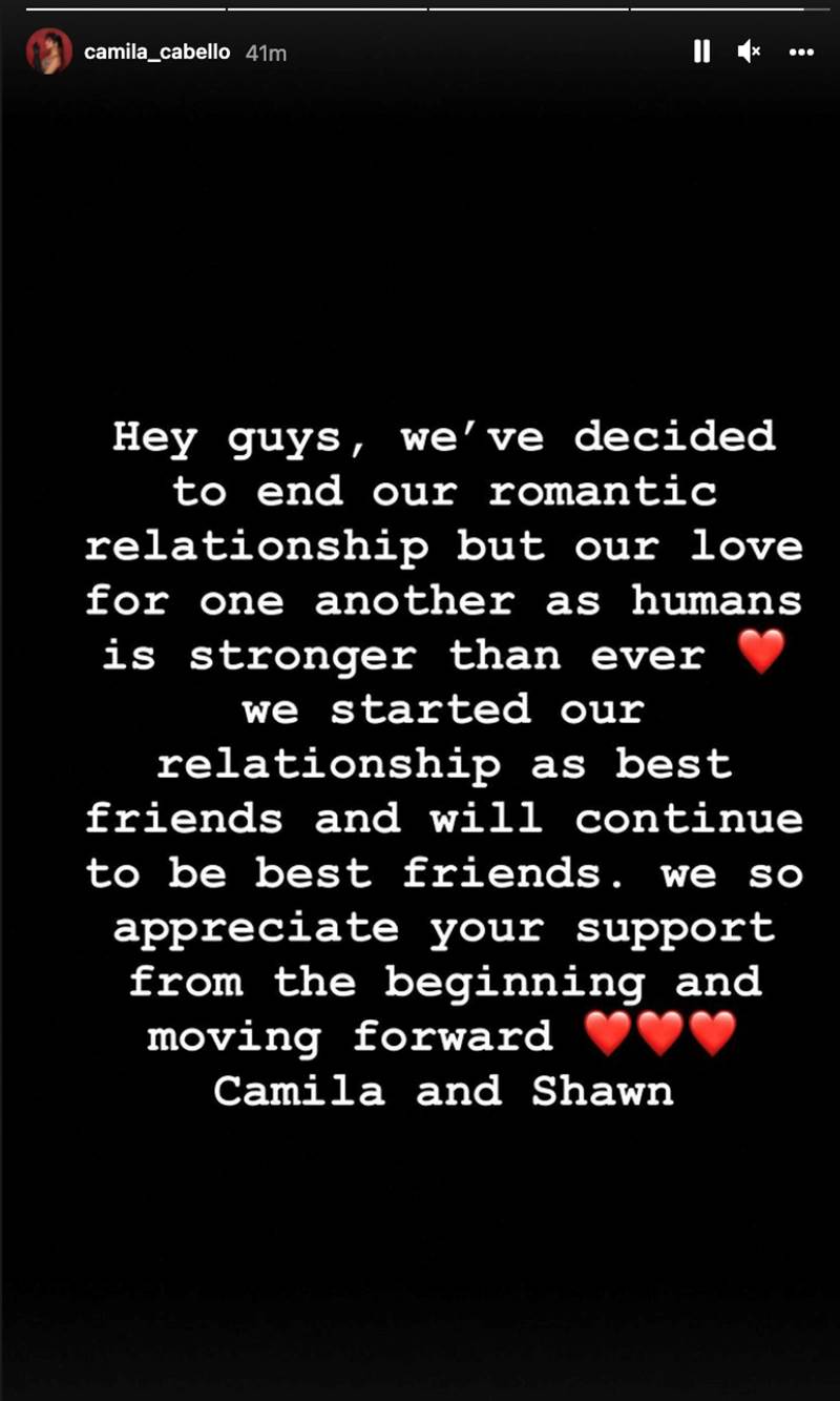 Ambos publicaron el mismo mensaje en sus historias de Instagram el miércoles por la noche y firmaron el mensaje como “Camila y Shawn”.