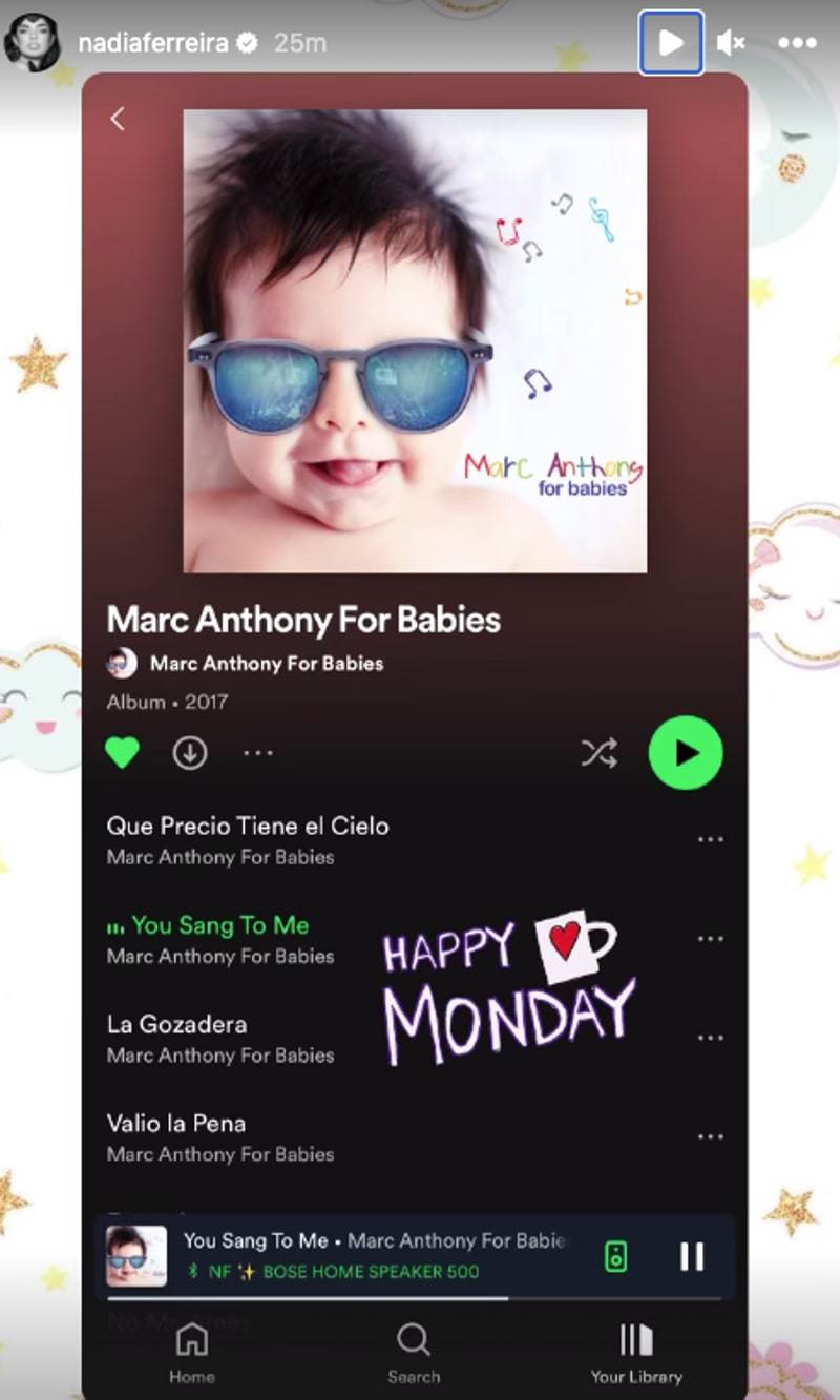 En una reciente publicación compartida por la paraguaya, se aprecia el playlist denominado Marc Anthony for Babies, álbum que según la fecha que figura en el post fue lanzado por el cantante en 2017 y cuenta con una selección de 10 temas del gran catálogo del artista: “Vivir Mi Vida”, “Deja Que Te Bese”, “Que Precio Tiene el Cielo”, “Ahora Quien”, “Escapémonos”, “Tu Amor Me Hace Bien”, “Valió la Pena”, “La Gozadera”, “No Me Ames” y el clásico “You Sang To Me”.