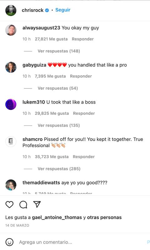“Estoy molesto por lo que te paso. Te contuviste. Un verdadero profesional”, escribió un fan debajo del último post de Chris Rock. “Que forma de mantener las cosas así de cool y mostrar algo de clase, Chris Rock! #Respira”, escribió uno más. En tanto, un tercero comentó, “Gracias por ir más allá y mantener la compostura. Una agresión es una agresión. Si ese chiste hubiera salido de la boca de Wanda (Wanda Skyes), y hubiera pasado lo mismo, la seguridad habría hecho escoltar a Will. Es vergonzoso que los Oscar no te brindaran la misma cortesía”.