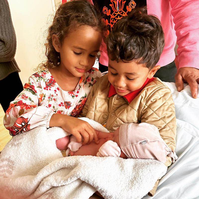 “¡Ya está aquí!”, escribió la feliz mamá al lado de la foto. La imagen no sólo muestra la dicha familiar, sino el primer momento en el que sus hijos mayores, Luna y Miles, conocen a la pequeña aún en el hospital y poco después de haber llegado al mundo.