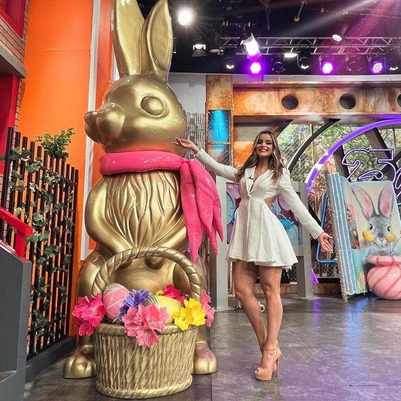 Molina, quien es colaboradora de Lili Estefan y Raúl de Molina en El Gordo y La Flaca (Univision), se dejó ver muy guapa en su visita al foro de Televisa, pues usó un vestido corto de color blanco, con cut-outs en los costados y escote en la espalda. Entusiasmada, participó en distintos segmentos del programa, y lo mismo se dejó ver como ayudante de cocina que con una simpática y colorida botarga.
