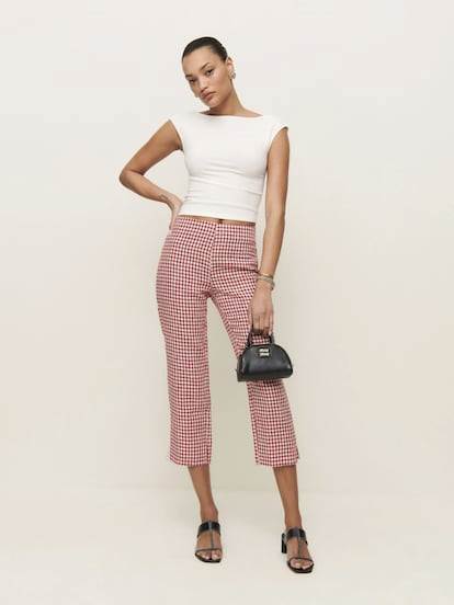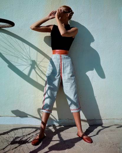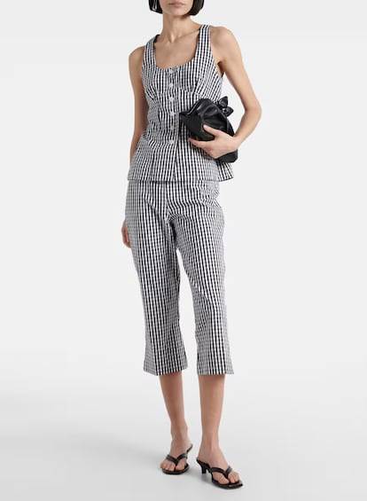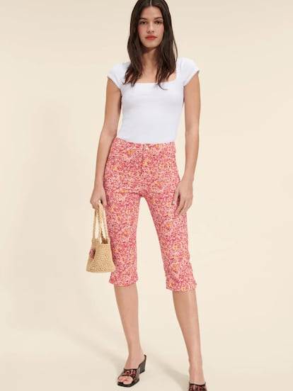 Otros estampados que dejan su impronta en la silueta capri esta temporada son los cuadros vichy, las microflores y las rayas verticales. Ya sea en forma de total look con prendas como chalecos o crop tops a juego en el mismo tejido —una marca casi registrada de la firma Rouje— o en un alegato de entretiempo, junto a gabardinas y bailarinas, resulta un acierto seguro.