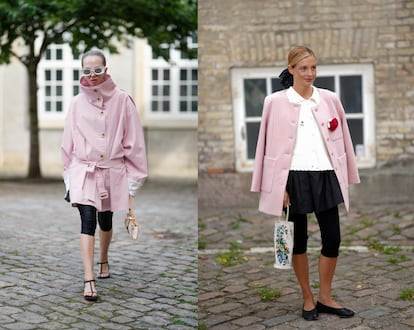 Otras formas sublimes de secundar el fenómeno —según la CFW— son la de añadir un pañuelo como fajín a la cintura (la prescriptora Annabel Rosendahl relaja la silueta incluyendo una camiseta básica oversize) o prendas de abrigo en rosa palo, el color de la pasada primavera. La instagramer portuguesa Mafalda Patrício remata la jugada con la silueta de bailarina que genera una minifalda globo sobre el legging.