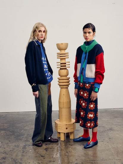 El objetivo no es crear un fondo de armario —que también—, si no, como señalan desde Bobo Choses, apostar por prendas que cuenten quienes somos. La teatralidad, aquí, es ley: las camisas se llenan de volantes peplum, lazos y bolsillos exagerados; en pantalones, las siluetas cocoon y relaxed conviven con leggings combinables y jeans patchwork, mientras que las sudaderas y cárdigans recurren a bordados y contrastes de color para sumar dimensión.