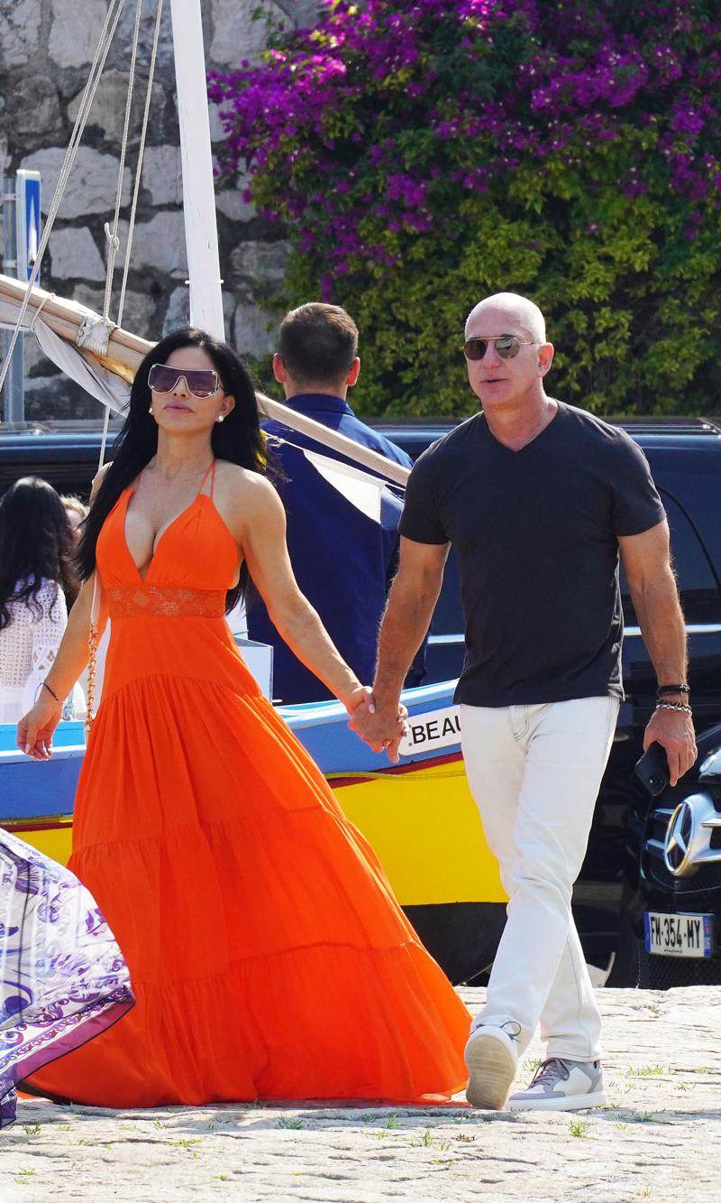 El pasado fin de semana, el fundador de Amazon y la periodista fueron captados llegando al pueblo costero de Èze, para más tarde tomar el almuerzo en el famoso hotel La Chèvre d’Or. En esta salida, Lauren lució su espectacular figura en un vestido largo de color naranja brillante, con un profundo escote en V, el cual complementó con un bolso blanco.