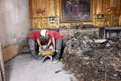 En lo que va de semana han retirado ya las vigas y las cubiertas de madera de las cuatro capillas más afectadas por el fuego. “Lo que se ha quemado son las cubiertas, las vigas aguantaron, pero también hay que quitarlas”, explica el arquitecto. La intervención no va a ser la misma en las cuatro estancias dañadas. En la capilla de la Asunción y en la entrada de la Puerta de San Nicolás, las bóvedas también van a tener que ser sustituidas porque se vencieron tras el incendio ―en el caso de la primera, dos terceras partes, y en la que servía como almacén, “un agujero menor”―. “Pero ha habido que tirarlo todo y colocar una estructura provisional”, señala Ruiz Cabrero. En las otras dos, la de San Nicolás de Bari y la de Jesús Verde, lo que se ha retirado es la madera de la cubierta, que ha caído sobre la bóveda y las vigas. Sobre las cuatro se va a colocar otra cubierta de chapa para protegerlas de la lluvia, un trabajo que se esperaba terminar ayer miércoles.