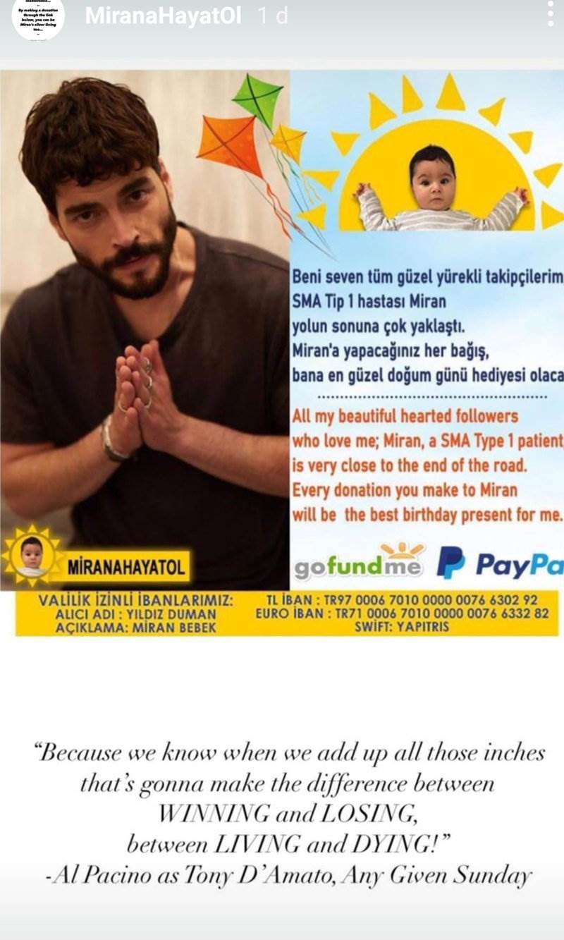 “A todos mis seguidores de buen corazón que me aman, Miran un paciente de Atrofia Muscular Espinal (por sus siglas en inglés SMA) tipo 1, está muy cerca del final del camino. Cada donación que hagan a Miran será el mejor regalo de cumpleaños para mí”, escribió Akin en una publicación en Instagram stories. Con la popularidad del actor y los entregados que son sus fans, quizá pronto los seres queridos pequeño Miran logren su objetivo para darle una mejor calidad de vida.