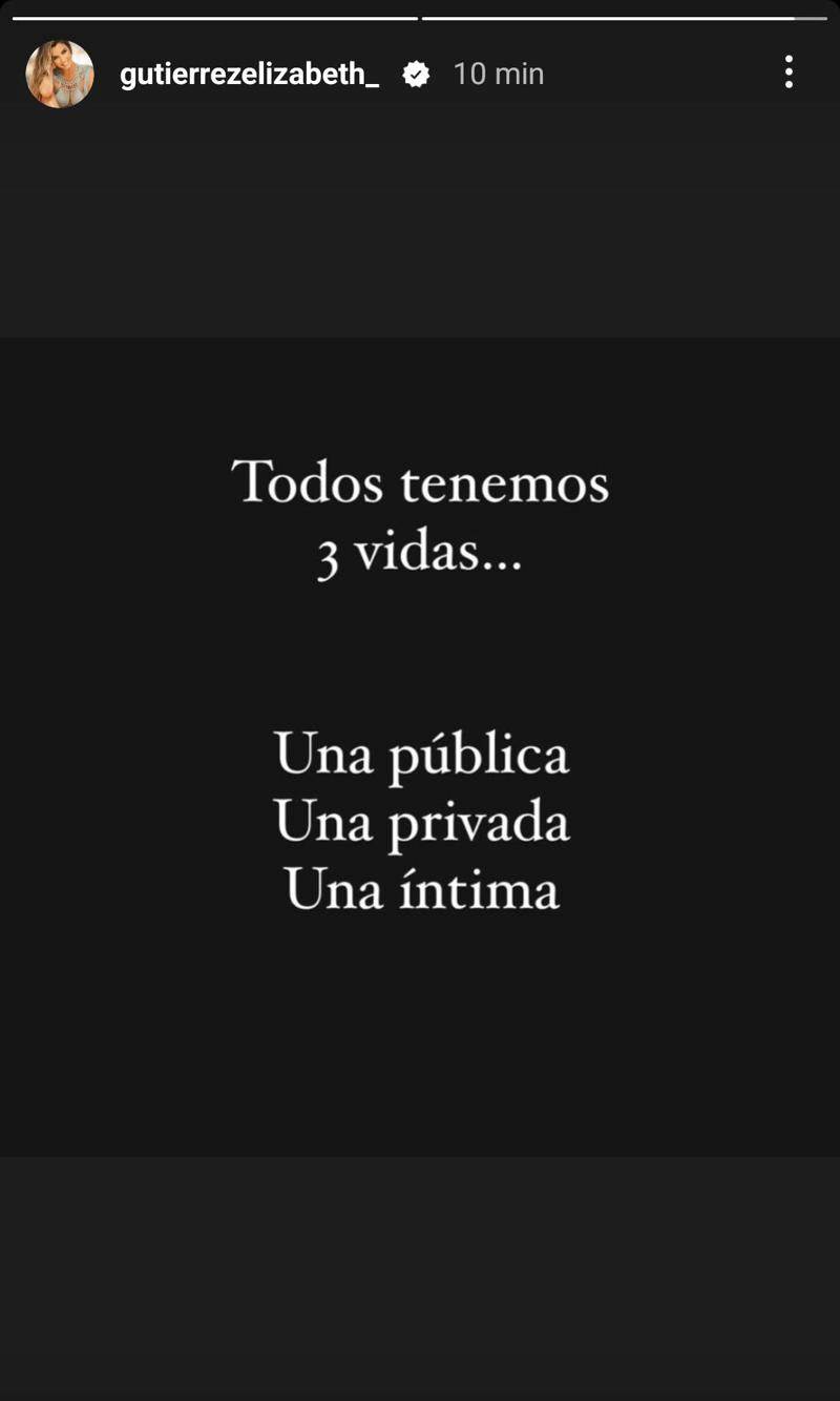 La mañana de este 25 de julio, Elizabeth Gutiérrez tomó sus historias de Instagram para publicar un breve y muy reflexivo mensaje. “Todos tenemos tres vidas... Una pública, una privada y una íntima”, se lee en un fondo negro.