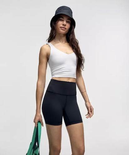Antes de dar el salto masivo al armario de calle, esta clase de tops iniciaron su andadura en el ámbito de la ropa de deporte como evolución del sujetador deportivo, especialmente en aquellas firmas enfocadas a la práctica de ejercicio, pero con propuestas que pueden funcionar sin dificultad en conjuntos urbanos. Por poner un ejemplo, en Lululemon se pueden encontrar este tipo de tops con sujetador incorporado, pero en su web explican que están pensados para la práctica de yoga (el popular modelo Align), si bien a simple vista parece una camiseta básica de fondo de armario, no se asemejan exactamente a un sujetador de entrenamiento. En Oysho también se pueden encontrar opciones de camisetas con sujeción incorporada, tanto diseños con copas extraíbles como tank tops de tonos lisos. Junto con estas referencias pertenecientes a marcas deportivas, si se quiere apostar por una camiseta con sujetador tampoco hay que olvidar las firmas especializadas en ropa interior. En Intimissimi ofrecen bra tops de mircrofibra adecuados para llevarlos “como prenda interior o exterior”, especifican en la propia tienda online de la marca. A diferencia del modelo viral de Uniqlo, donde se busca un efecto más natural, en la marca italiana abogan por camisetas que enfatizan el pecho e incluso permiten añadir copas laterales extra para un mayor volumen.