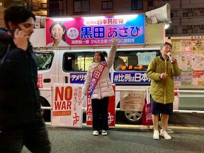 Sucede de la siguiente forma: llega una pequeña furgoneta, pongamos, del Partido Comunista, la fuerza minoritaria en el extremo izquierdo, y se detiene frente a un supermercado de barrio. Despliegan banderas y altavoces. La candidata del distrito baja del vehículo, y pronuncia su discurso ante unos pocos que prestan atención. Flanqueada por un cartel que pide subir los impuestos a los ricos, critica el creciente militarismo de Takaichi: “Este Gobierno está pensando en usar el dinero del país para las armas”. Alerta: “La política se está sesgando cada vez más hacia la derecha”. Termina su breve discurso, le estrecha la mano a los asistentes, hace reverencias, recoge todo y se marcha en furgoneta.