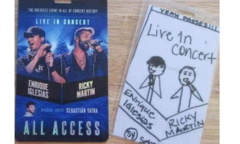 Para poder estar junto a él en el Amway Cente, Anna llevó un improvisado pase de backstage que podría haber dibujado el mismo Enrique. “Yeah passes!!!”, se puede leer en la parte superior de la pieza en la que también se aprecia un dibujó del hijo de Julio Iglesias junto a Ricky. Era fácil ubicar a Enrique, pues es el de la gorra, mientras el puertorriqueño luce un peinado de fleco alto. Una perfecta reproducción del pase original, en donde también aparecen los nombres de ambos.