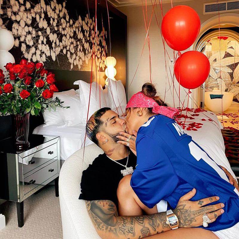 Karol G compartió en su cuenta de Instagram, donde tiene más de 31 millones de seguidores, un par de imágenes de la celebración de su aniversario. En ambas imágenes se aprecia a los enamorados en actitud cariñosa en un cuarto decorado con rosas y globos de color rojo, además de pétalos en la cama.