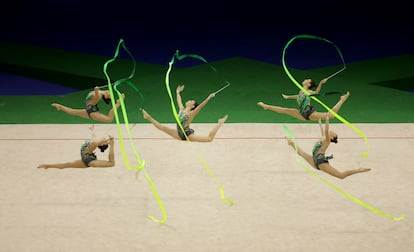 España salió en el último turno en la final de las cinco cintas en el Parque Olímpico de Río de Janeiro (Brasil). El mal arranque de sus rivales —con caídas del aparato, nudos y fallos en las colaboraciones e intercambios— allanó el terreno y abrió una rendija de esperanza para las españolas. Bulgaria, Uzbekistán, Polonia, Brasil, Israel e incluso la campeona del concurso general, Japón, tropezaron en un ejercicio maldito que se atragantó hasta a las mejores. Solo quedaban China y España por competir. Las asiáticas no fallaron: firmaron una composición impecable, sin una sola caída, y pusieron el listón muy alto. Para las españolas la ecuación parecía sencilla, o rozar la perfección, o resignarse al bronce. Como ya ocurrió el sábado en el All-Around, el aparato se les escapó de las manos y se volvió a ir al suelo, esta vez en dos ocasiones. La ilusión inicial de España se convirtió en un segundo bronce (25,950), por detrás de Japón (26,650) y de una sólida China (27,550). En la siguiente final, de manera inesperada, fue Ucrania quien frustró las oportunidades de España de llevarse algún oro en el Mundial, pero también de sumar algún podio más. Y las españolas se marcharon de Río de Janeiro con el orgullo de haber competido por lo más alto, y dos bronces en el bolsillo.