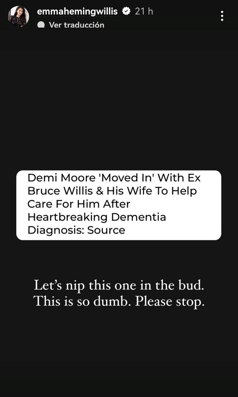 “Vamos a cortar esto de raíz. Esto es tan tonto. Por favor paren”, escribió Emma sobre una captura de pantalla de uno de los encabezados de una nota en la que se asegura que Demi viviría con ellos para estar al pendiente de su ex.