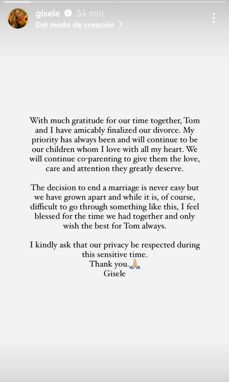 Bündchen reconoce que no fue nada sencillo llegar hasta este punto, pero que no había vuelta atrás, pues estaban cada vez más alejados. “La decisión de terminar un matrimonio nunca es fácil, pero nos hemos distanciado y aunque es, por supuesto, difícil pasar por algo así, me siento bendecida por el tiempo que pasamos juntos y solo deseo lo mejor para Tom siempre”. Para finalizar su comunicado, Gisele de 42 años pidió consideración ante el delicado momento que atraviesan. “Pido amablemente que se respete nuestra privacidad durante estos momentos sensibles”.