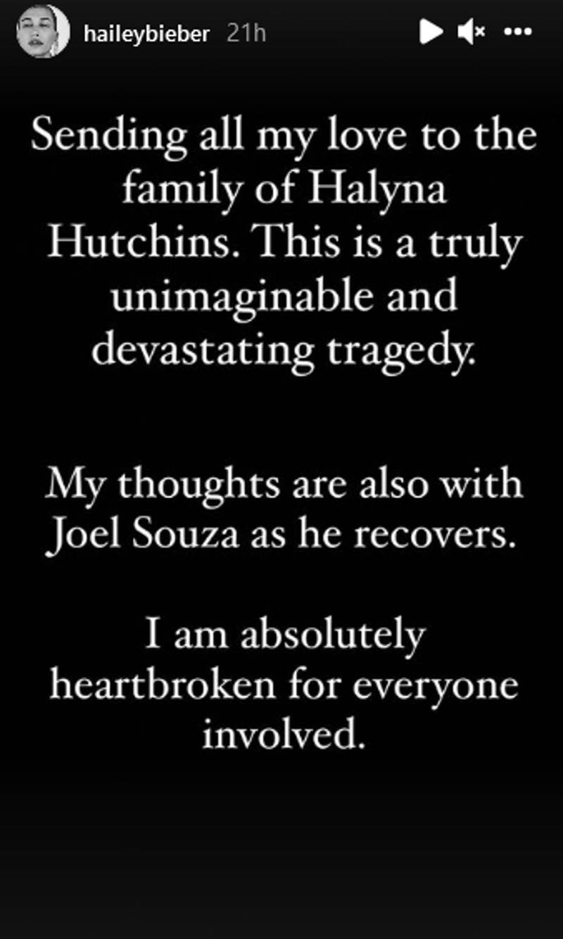 Hailey dio a conocer su declaración a través de una historia de Instagram. “Envío todo mi amor a la familia de Halyna Hutchins. Esta es una tragedia verdaderamente inimaginable y devastadora”, escribió. “Mis pensamientos también están con Joel Souza mientras se recupera”.