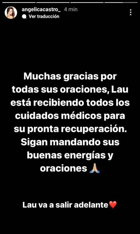 Horas después de ese primer post, Angélica Castro publicó uno más en el que agradeció a todos por sus buenos deseos por la salud de Laura. “Muchas gracias a todos por sus oraciones, Lau está recibiendo todos los cuidados médicos para su pronta recuperación. Sigan mandando sus buenas energías y oraciones. Lau va a salir adelante”.
