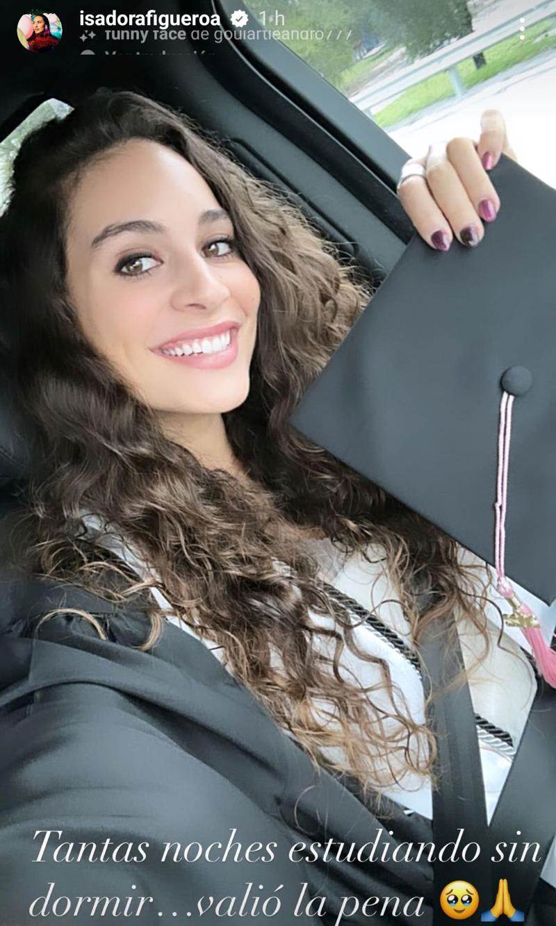 “Tantas noches estudiando sin dormir... valió la pena”, escribió la joven en sus historias de Instagram al compartir una selfie en la que se le veía sonriente, usando una toga y con un birrete en la mano.