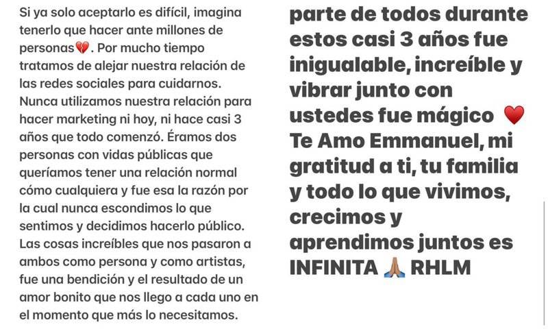 “Gracias a todos por acompañarnos en nuestras locuras. El amor que sentimos por parte de todos durante estos casi 3 años fue inigualable, increíble y vibrar junto con ustedes fue mágico. Te amo Emmanuel, mi gratitud a ti, tu familia y todo lo que vivimos, crecimos y aprendimos juntos es INFINITA. RHLM (Real hasta la muerte)”.
