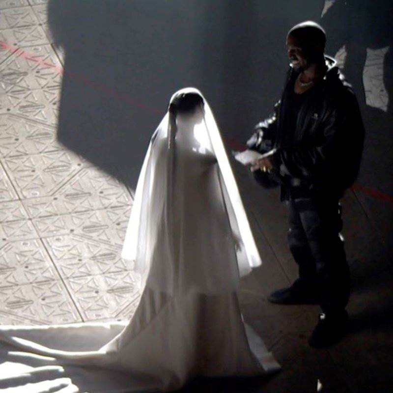 Kim lució un vestido Balenciaga Couture estilo minimalista con un gran velo que cubría su rostro y le llegaba casi a los tobillos. Tras finalizar la presentación, Kim y Kanye a abandonaron el lugar tomados de la mano, dejando a sus fans con más preguntas que respuestas.