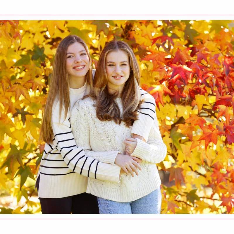 En la imagen que ha sido publicada este lunes en la página web de la Casa Real Española, se ve a la princesa de Asturias y a su hermana de medio cuerpo, sonrientes y con los brazos entrelazados ante un fondo de hojas de varios colores, muy típico del otoño.