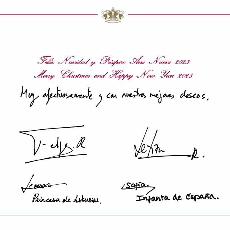 La foto va acompañada de una tarjeta de felicitación de los monarcas y sus hijas en la que se lee: “Feliz Navidad y Próspero Año Nuevo 2023”, en español y también en inglés. Y terminan con un saludo el escueto pero emotivo mensaje: “Muy afectuosamente y con nuestros mejores deseos”.