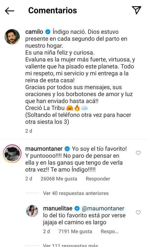 Luego de que Evaluna y Camilo compartieran las noticias del nacimiento de Índigo, el pasado fin de semana, los mensajes de buenos deseos inundaron las redes sociales y entre ellos destacó el comentario de Mau Montaner. “Yo soy el tío favorito! Y puntooo! No paro de pensar en ella y en las ganas que tengo de verla otra vez!! Te amo Índigo!!”, comentó el hermano de Evaluna.