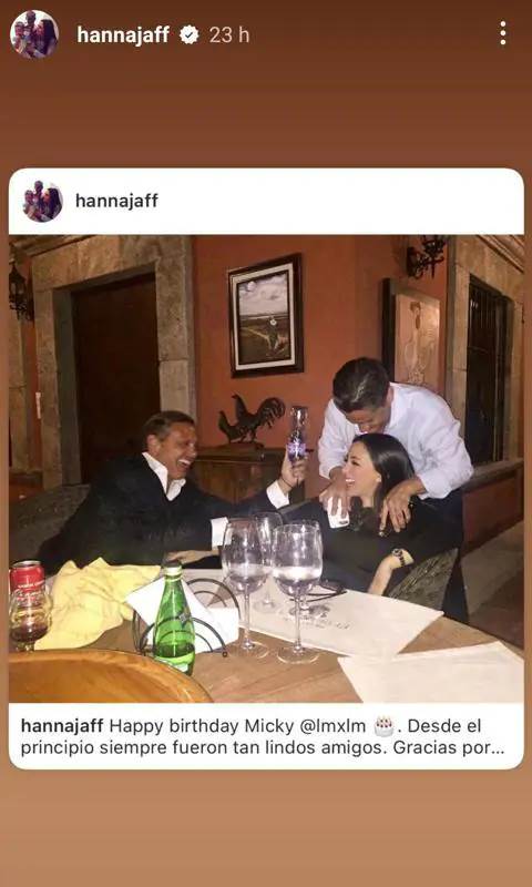 En su perfil de Instagram, donde tiene más de un millón de seguidores, Jaff publicó una imagen en la que Luis Miguel aparece de perfil, viendo hacia el horizonte, mientras que Hanna se deja ver en un primer plano. La también autora de libros le extendió una cariñosa felicitación y se refirió a él como su ‘amigo’. Jaff comentó la fotografía escribió: “?Feliz cumpleaños @lmxlm! Eres una gran persona, amigo e icono. Gracias por tanto ?”.