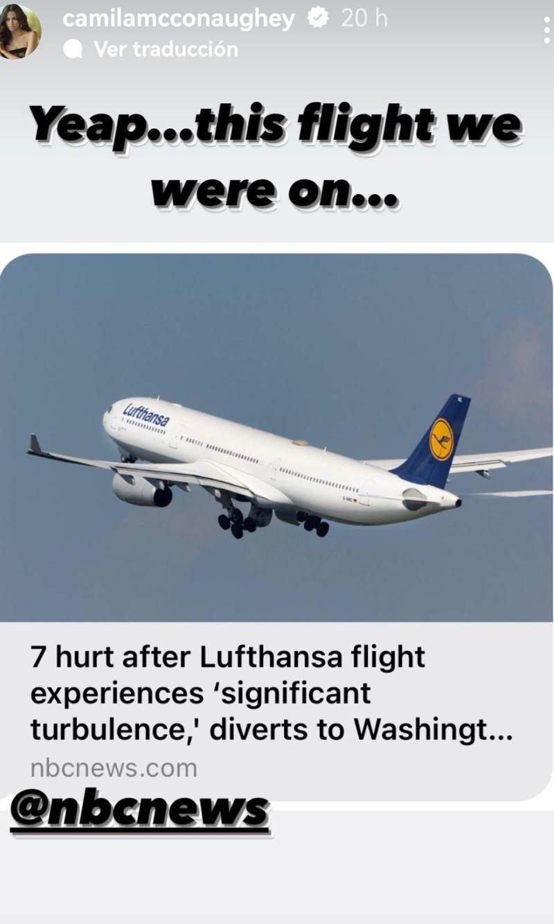 La esposa del actor agradeció la atención del hotel que los acogió en Washington D.C., lugar en el que pasaron la noche debido al aterrizaje de emergencia. “@officiallymcconaughey y yo llegamos al bar 1 minuto antes del cierre... dormimos bien, tomamos un nuevo vuelo hoy, al viaje siguió”.