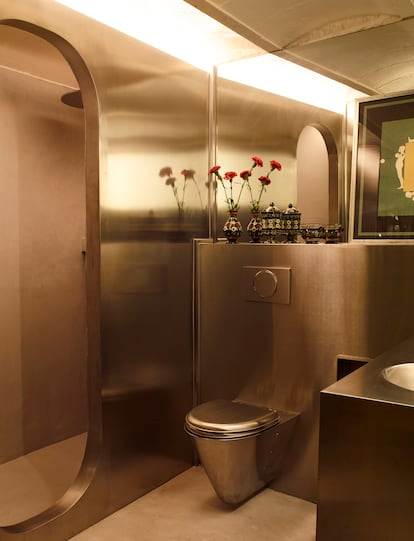 Pioneros en saber atisbar las tendencias del sector antes que nadie –como el uso de los azulejos en su casa de alquiler cerca de Segovia, o el potencial estético de una antigüedad en ambientes modernos que podemos encontrar su tienda madrileña–, Navarro y Aragón recuerdan un proyecto que desarrollaron basándose en diferentes acabados de metal como el inox cepillado o brillante, la plata y el espejo. “Ahora se está difundiendo mucho en redes sociales pero lo publicamos por primera vez en 2020”, señalan. La vivienda incluye un baño elaborado en acero inoxidable inspirado en los aseos de los aviones, una cocina en ese mismo material combinada con cromo, espejos y plata y mobiliario que fusiona acero, terciopelo y más espejos. “Ojalá fuera innecesario decirlo, pero es un proyecto hecho para una mujer. En ningún momento de la conversación con nuestra clienta hablamos de las supuestas cualidades masculinas o femeninas que tienen los materiales porque no creemos en esa idea. Era su casa, no una declaración de género”.