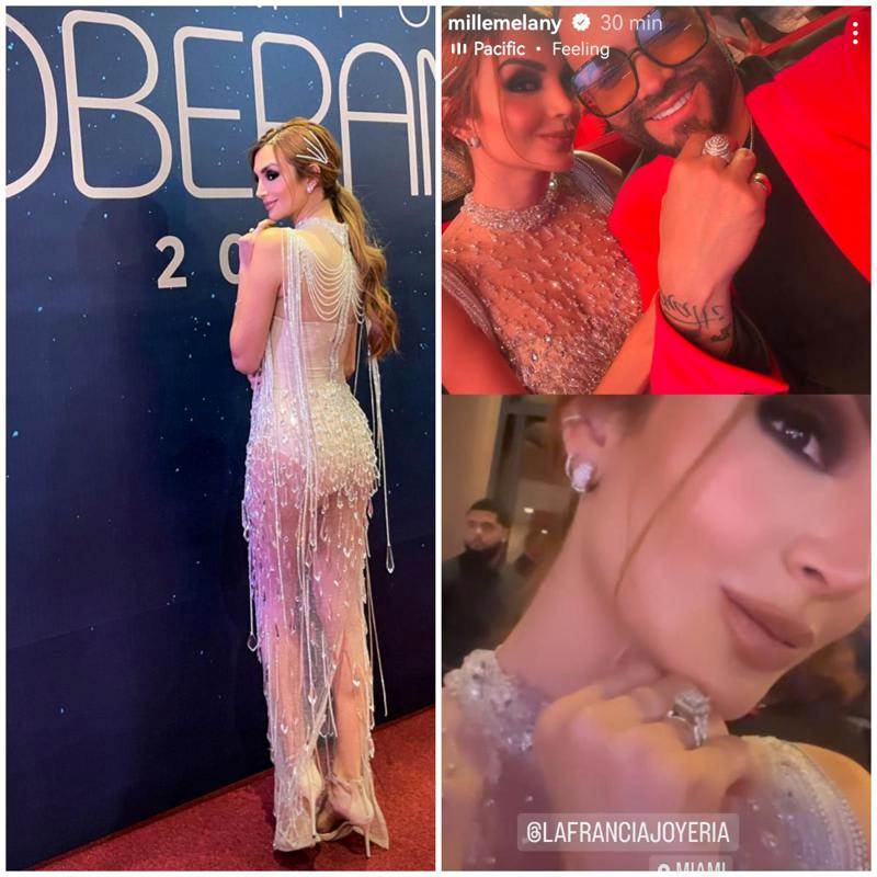 El look de Melany fue centro de las miradas, pues lució una creación de la diseñadora dominico-libanesa Giannina Azar, una de las diseñadoras favoritas entre las celebridades latinas. Para la ocasión, la futura esposa de Nacho optó por un jewel dress semi transparente con pedrería y un enterizo nude que marcaba a la perfección su espectacular figura. Para completar su atuendo, Melany llevó joyas de La Francia; un par de pendientes además de unos vistosos anillos.