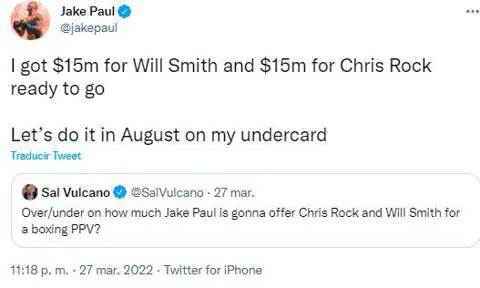 ¿Cómo se hizo la oferta? Todo empezó cuando el comediante Sal Vulcano tuiteó lo siguiente, minutos después de la bofetada en los Oscars: “Más o menos ¿cuánto va a ofrecer Jake Paul a Chris Rock y Will Smith por un PPV de boxeo?”. A lo que Jake Paul respondió: “Tengo $15 millones para Will Smith y $ 15 millones para Chris Rock listos para comenzar. Hagámoslo en agosto en mi cartelera”.