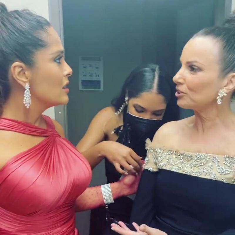 En su perfil de Instagram, la actriz de origen mexicano compartió un divertido video en el que ambas aparecen conversando, mientras una de sus asistentes intenta desenganchar el finísimo guante Gucci de Salma del vestido de pedrería de Fran, el cual era un Reem Acra.