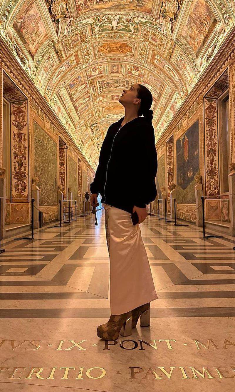 En esta escapada por Italia, la cantante se ha dejado ver con cómodos looks, como una hoodie negra, una gorra del mismo color, además de uan falda larga satinada hasta los tobillos. Eso sí, no ha dejado por nada sus altísimos tacones de plataforma, mismos con los que recorrió los Museos Vaticanos.