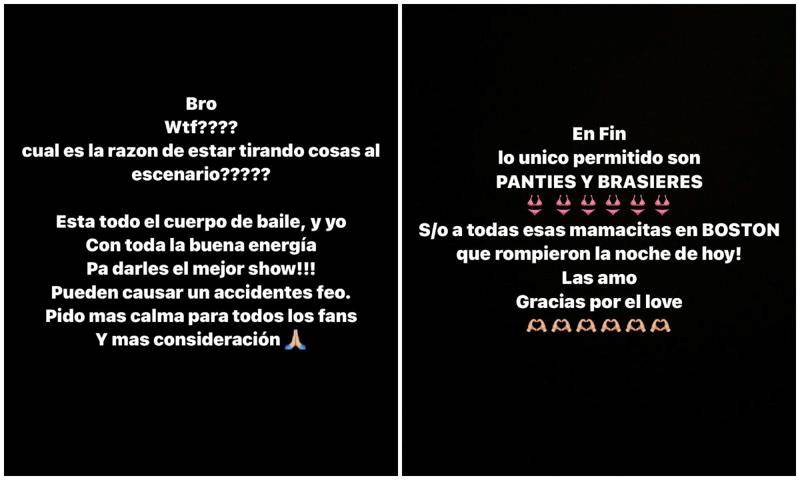 “Bro, wtf?? ¿Cuál es la razón para estar tirando cosas al escenario? Está todo el cuerpo de baile, y yo con yoda la buena energía pa’ darles el mejor show. Puede causar un accidente feo. Pido más calma para todos los fans y más consideración”, escribió en una story.