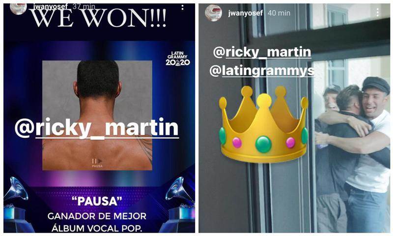 Ricky Martin ha anotado otro gran logro en su exitosa carrera musical. Durante la ceremonia previa a la 21ª entrega anual de los Latin Grammy, se dieron a conocer a los ganadores de una gran parte de las categorías, y entre ellos estaba el puertorriqueño quien conquistó la terna de Mejor Álbum Vocal Pop gracias a su disco Pausa. Sus fanáticos celebraron por todo lo alto el logro de su ídolo, así como sus seres queridos, y por supuesto su pareja, el artista plástico Jwan Yosef, quien festejó el gran triunfo de Ricky, quien está nominado en esta edición en otras dos categorías.