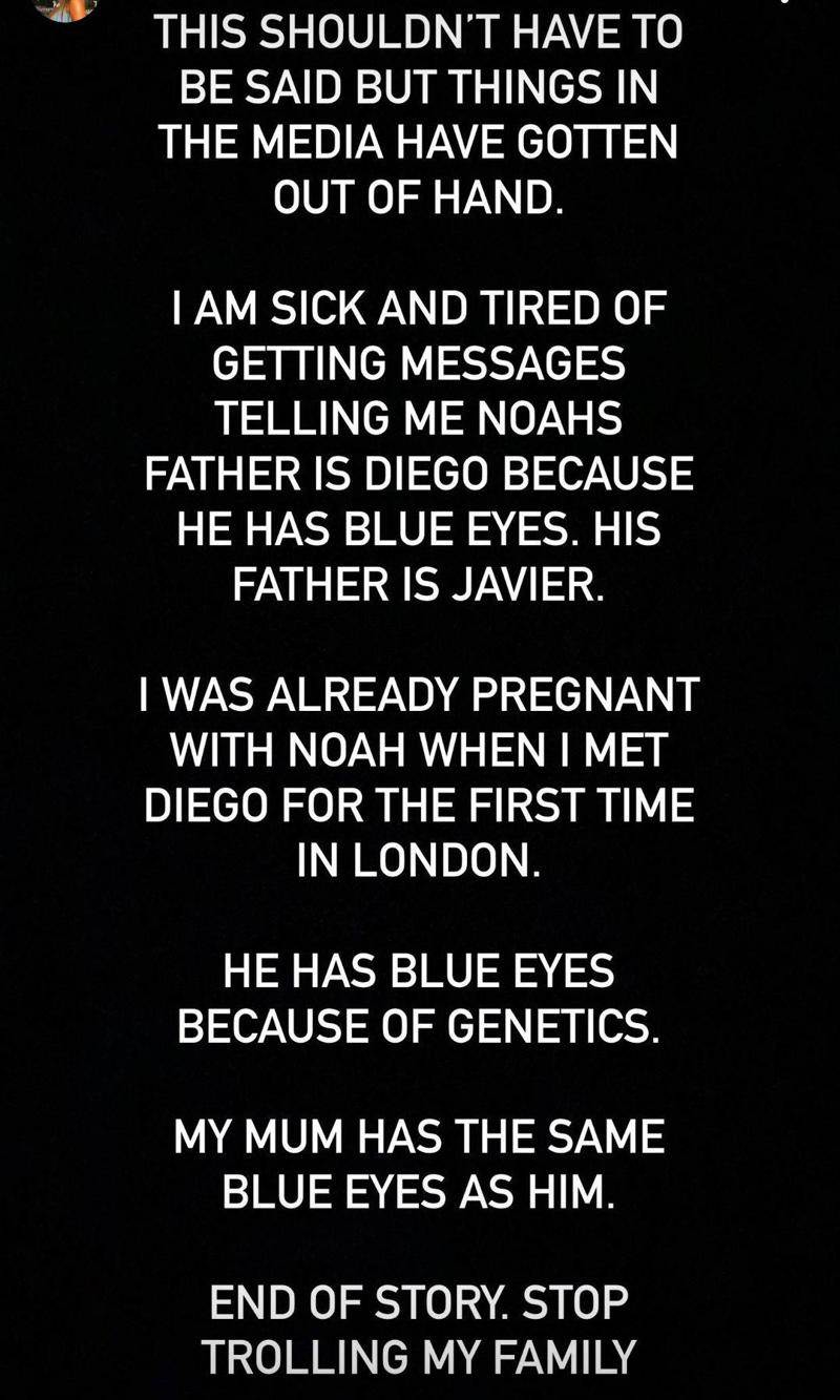 Cansada de los rumores sobre ella y su familia, Sarah Kohan compartió en Instagram stories un mensaje en el que ponía punto final a esas especulaciones. “Esto no tendría porque decirlo, pero las cosas en las redes se han salido de control”, se lee al inicio del mensaje. “Estoy enferma y cansada de tener mensajes diciéndome que el papá de Noah es Diego porque él tiene los ojos azules. Su papá es Javier”, continuó. Además de eso, Kohan también indicó que ella conoció a Dreyfus cuando ya estaba en la dulce espera de su hijo mayor. “Yo ya estaba embarazada de Noah cuando conocí a Diego por primera vez en Londres”.